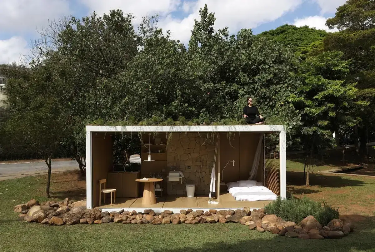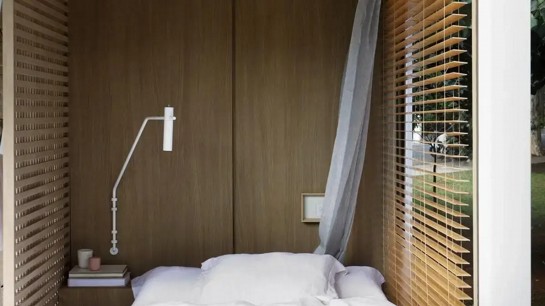 Com design escandinavo, o Estúdio Elo foi pensado para um morador, tendo como destaque o mobiliário planejado em madeira clara sustentável (padrão Grano, da Criare) que reveste todo o contêiner para que ele abrace o espaço e transmita a sensação de acolhimento e conforto necessário.
