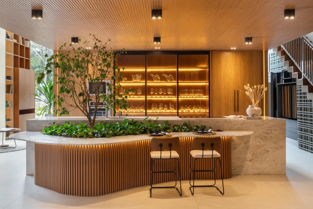 Os móveis planejados biofílicos incorporam madeira certificada, bambu e pedras naturais, promovendo um visual sofisticado e sustentável. Além disso, os tons claros são cada vez mais utilizados para reforçar a sensação de amplitude e aconchego nos ambientes.