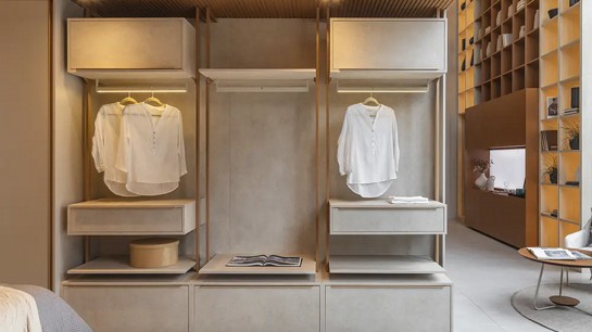 O closet modulado é composto por módulos pré-dimensionados que podem ser combinados entre si. Ele funciona como uma solução intermediária entre o guarda-roupa tradicional e o closet planejado sob medida.